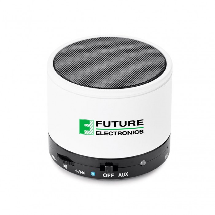 Metal speaker with controls for adjusting volume, play/pause, skipping songs, accepting/rejecting/redialing phone calls, a built-in microphone and LED status indicator, Compatible with audio devices that have a 3.5 mm audio jack and Bluetooth technology, Includes a multi-purpose charging/audio cable with USB, micro-USB and 3.5 mm plugs and a black drawstring pouch.